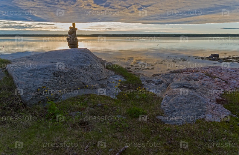 Вечер на берегу Белого моря. Солнце светит сквозь облака. Карелия, Россия, конец июня
