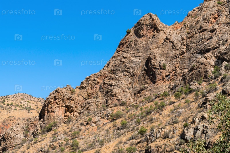 Скалистый выступ с острыми краями на склоне горы в горах Армении