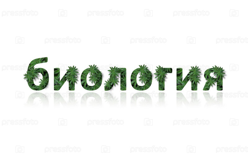 Русское слово "биология" стилизовано под коллаж из фотографий листьев люпина. Слово с зеркальным отображением, выделенное на белом фоне
