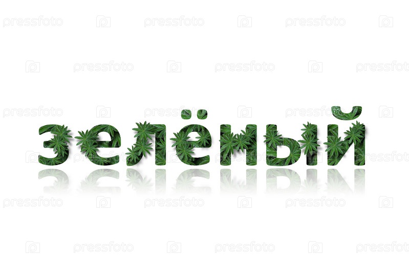 Русское слово "зеленый" стилизовано под коллаж из фотографий листьев люпина. Слово с зеркальным отображением, выделенное на белом фоне