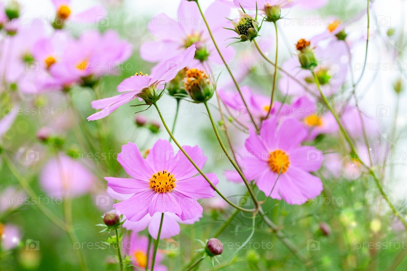 Цветущая розовая космея и семенные коробочки