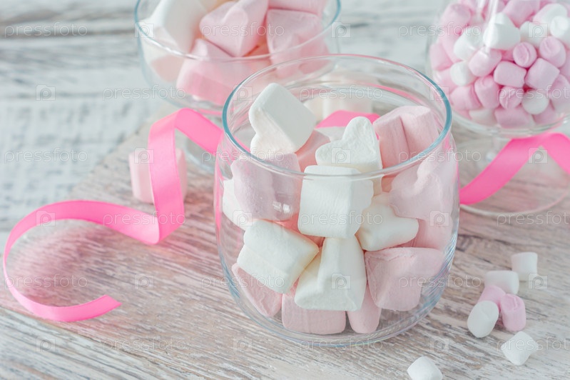 Чаша с вкусным зефиром и розовой лентой на белом столе, крупным планом
