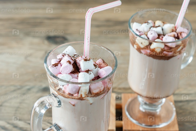 Горячий какао или шоколадный напиток с зефиром в стеклянной кружке на деревянном столе. Концепция уютных рождественских и новогодних праздников, пространство для копирования