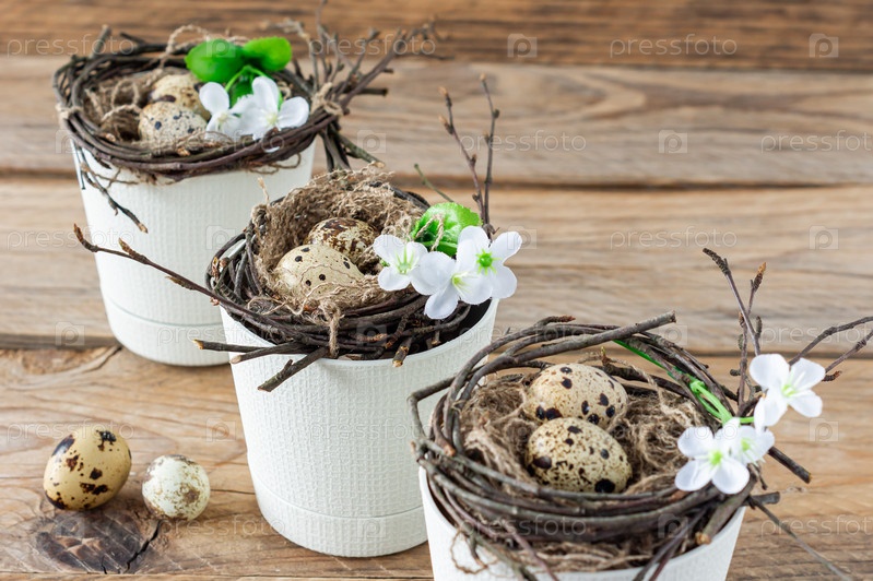 Композиция с гнездом из веток и перепелиными яйцами в горшках. Пасхальные праздники в деревенском стиле