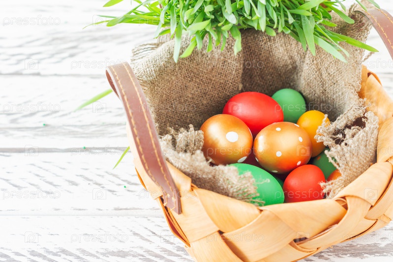 Раскрашенные вручную пасхальные яйца в корзине на белом деревянном фоне, крупным планом. Пасхальный фон