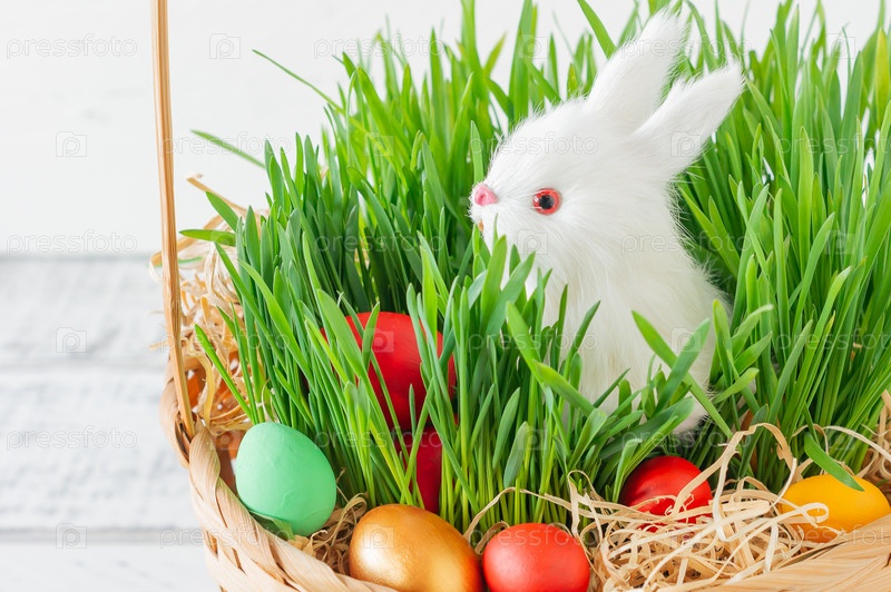 Пасхальная корзина с зеленой травой, наполненная яркими пасхальными яйцами и белым зайчиком. Счастливой Пасхи