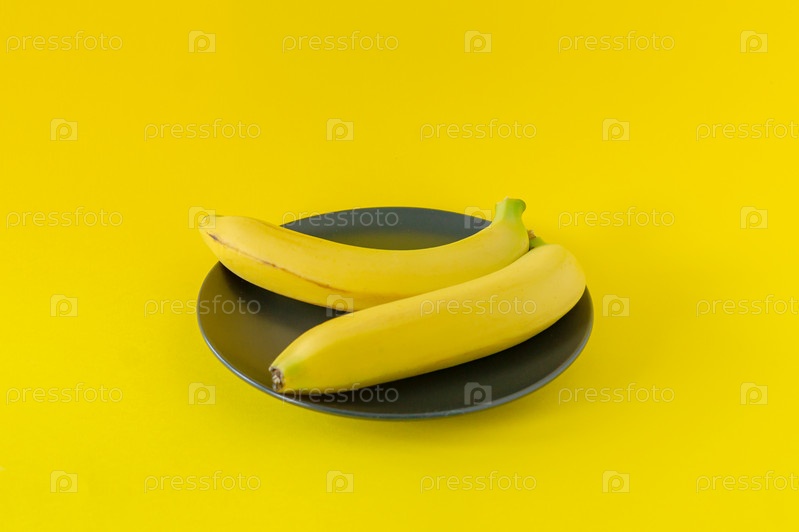 Спелый банан на черной тарелке на желтом фоне. Тропические фрукты для еды