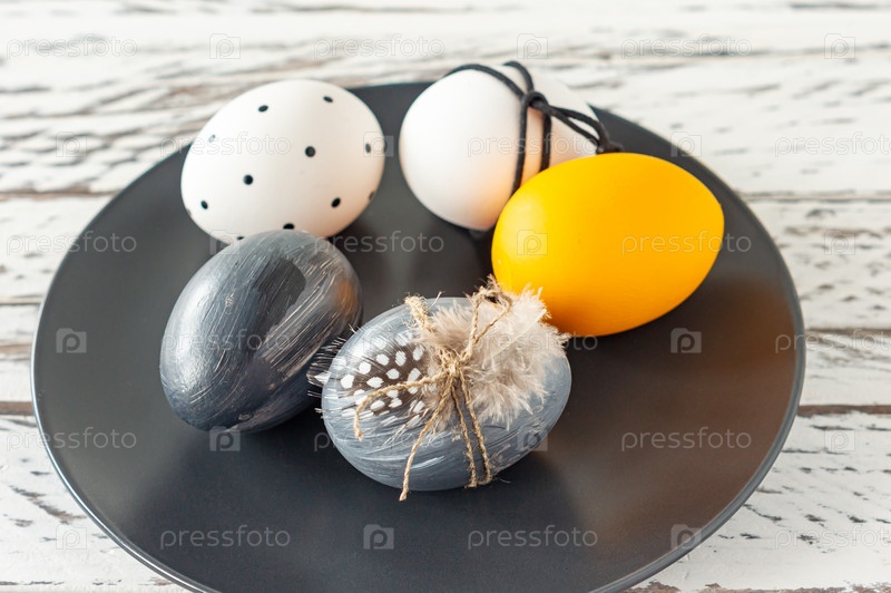 Модные цветные пасхальные яйца темных цветов и перья на тарелке на деревянном столе. Подготовка к пасхальным праздникам. Праздничная композиция