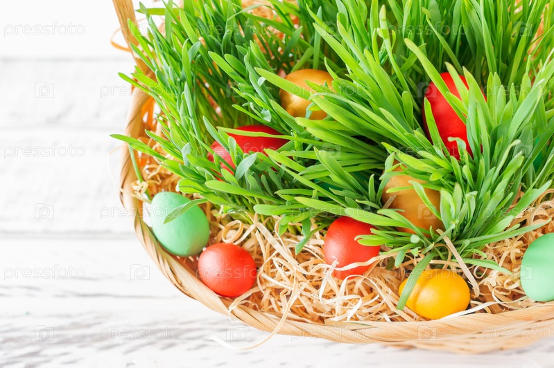 Пасхальная корзинка с зеленой травой, наполненная яркими пасхальными яйцами. Счастливой Пасхи