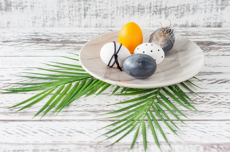 Модные цветные пасхальные яйца, зеленые тропические листья и перья на тарелке на деревянном столе. Подготовка к пасхальным праздникам. Праздничная композиция
