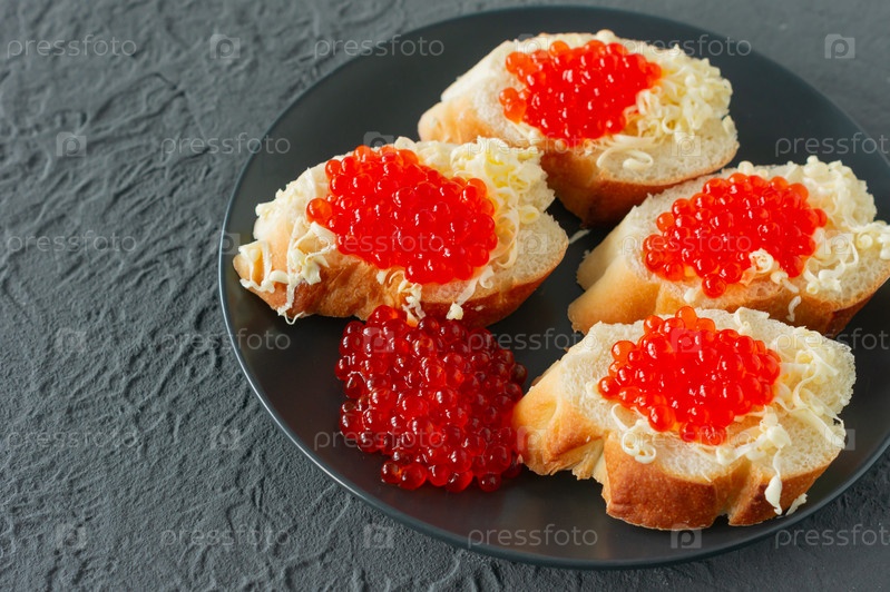 Бутерброды с красной икрой, лимоном и петрушкой на черной тарелке на бетонном фоне. Морепродукты