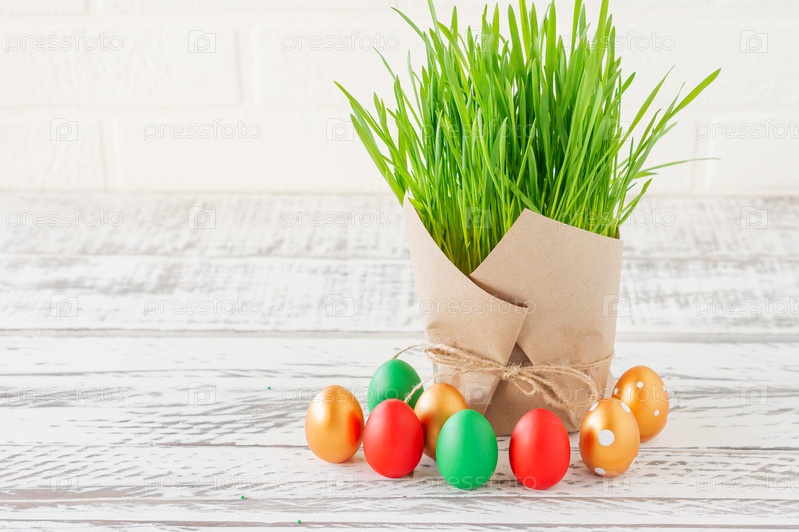 Счастливой Пасхи. Красочные пасхальные яйца в корзине. Пасхальный фон с копирайтом