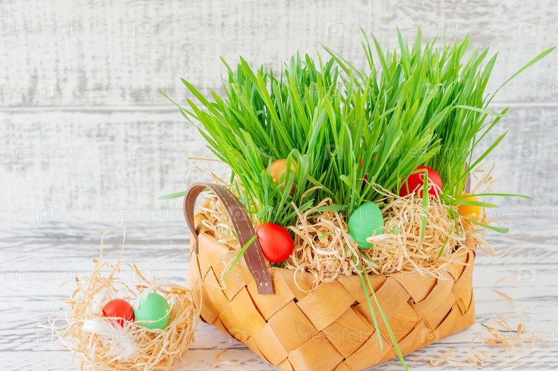 Пасхальная корзинка с зеленой травой, наполненная яркими пасхальными яйцами. Счастливой Пасхи
