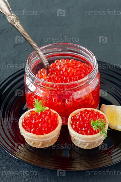 Тарталетки со сливочным маслом и красной икрой. Изысканная еда, закуски. Гастроном. Морепродукты