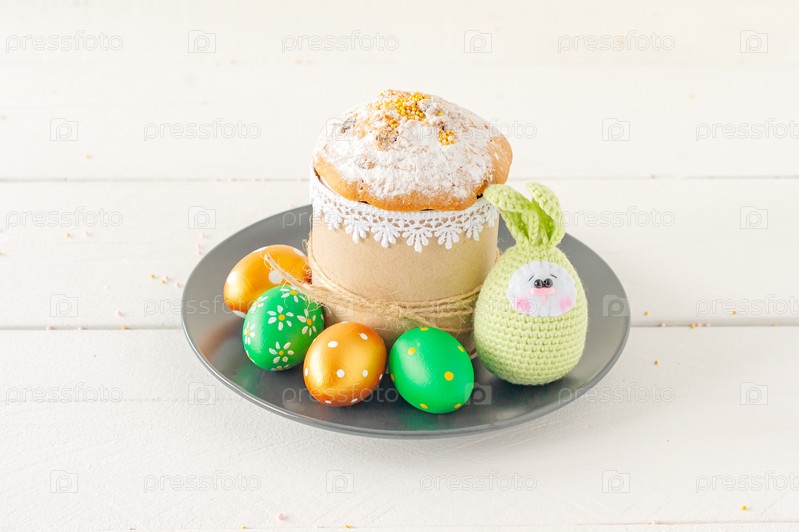 Украшение композиции Счастливой Пасхи праздник фон концепции. Кулич на тарелке с вязаными яйцами ручной работы. Пастельные цвета