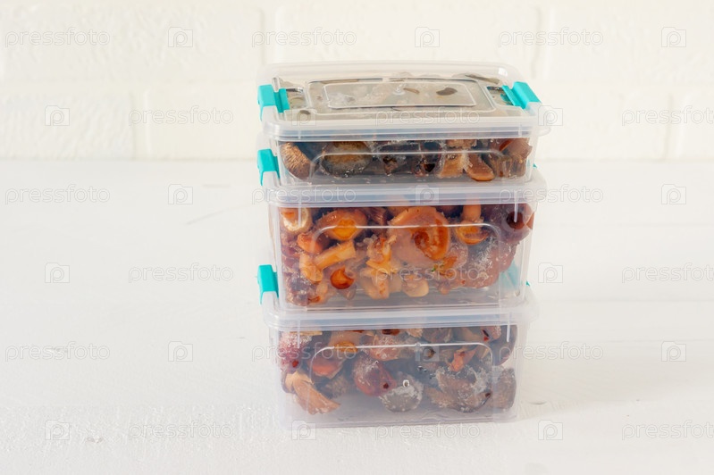 Полуфабрикаты. Замороженная еда. Мухомор опят в пластиковой таре. Заготовка еды на зиму