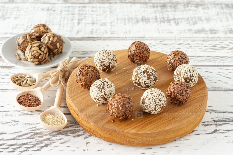 Здоровые сырые энергетические шарики. Конфеты веганские шарики фиников, мякоть кокоса, орехи на деревянном столе. Концепция полезных домашних леденцов без сахара