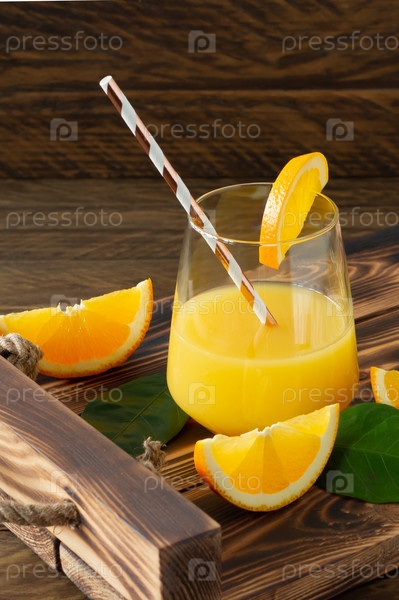Свежий апельсиновый сок в стаканах с разрезанными апельсинами на деревянном подносе. Деревенский натюрморт с цитрусовыми