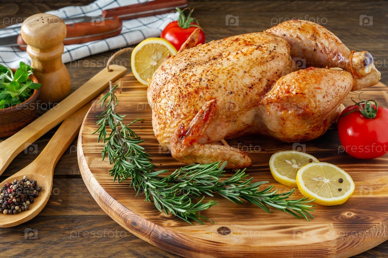 Целая курица-гриль с карамелизированной кожей и свежим розмарином на деревянном обеденном столе