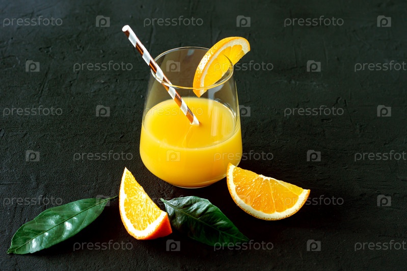Стакан сока и нарезанные апельсины с листьями на темном фоне