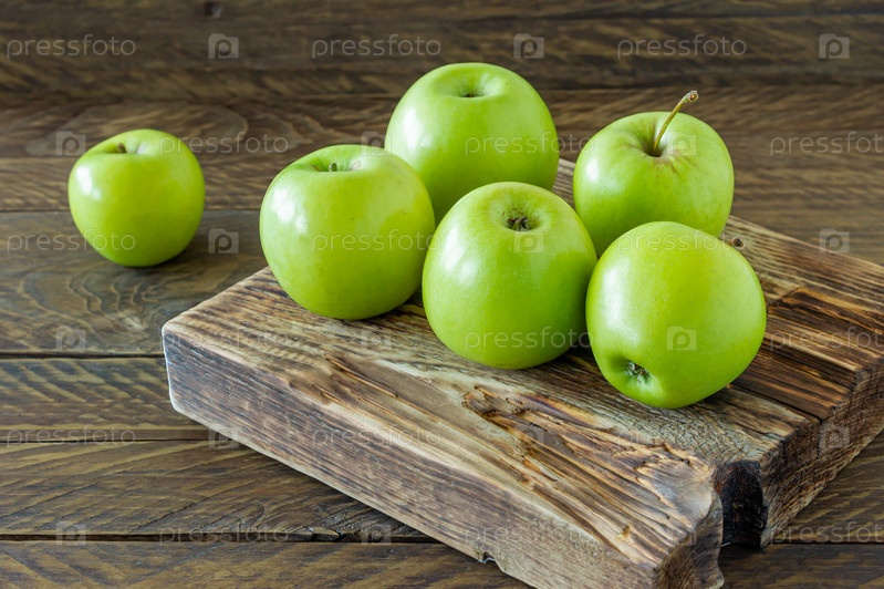 Зеленые спелые яблоки на деревянном столе. Деревенский стиль. экологически чистое хозяйство. устойчивая еда
