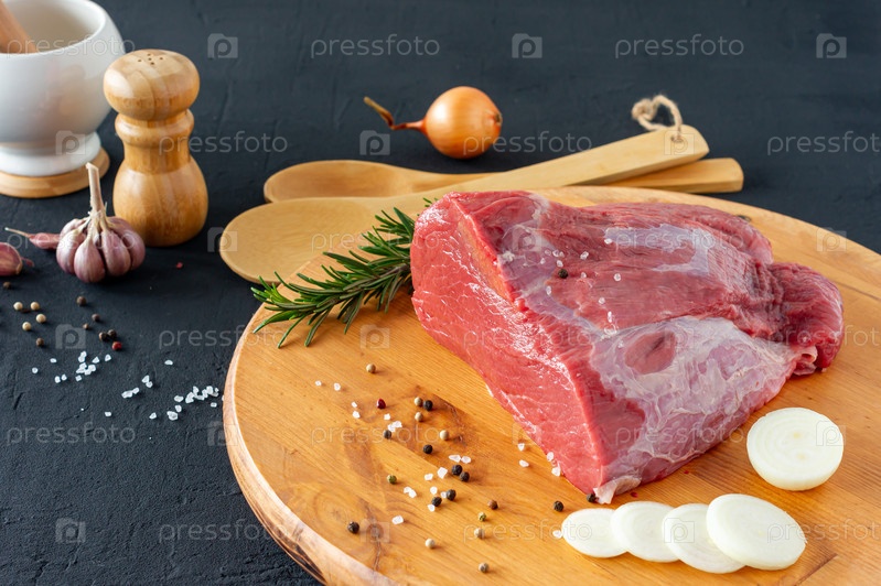 Филе говядины из сырого мяса на деревянной разделочной доске, веточки розмарина, разные перцы, соль и лук на темном фоне. Кусок свежей говядины для стейка или барбекю на гриле