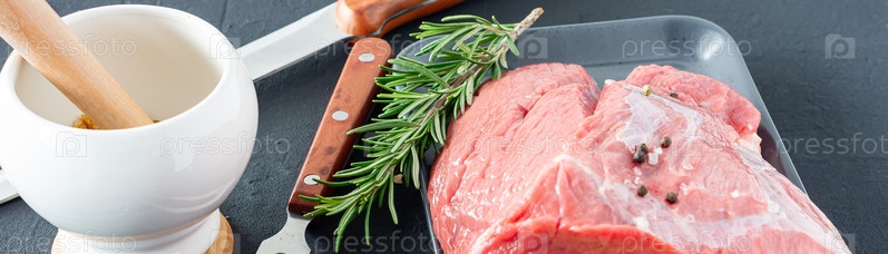 Сырой ростбиф с травами и специями в керамической форме для выпечки. баннер