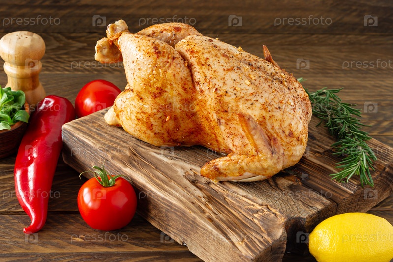 Жареный цыпленок со специями на деревянном фоне. Здоровое питание, диета или концепция приготовления пищи