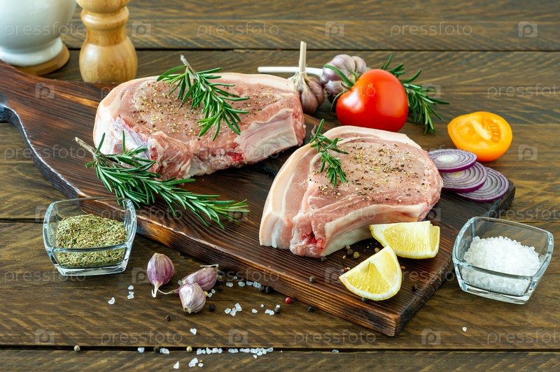 Кусочки сырого стейка из свинины со специями и травами, розмарином, солью и перцем на деревянной доске на деревянном фоне в деревенском стиле