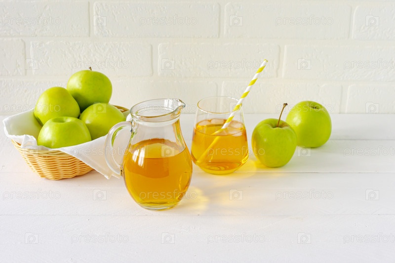 Свежий домашний яблочный сок и зеленые яблоки на белом столе. Здоровый утренний напиток