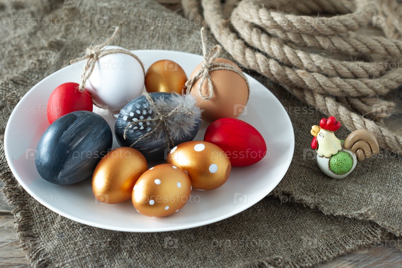 Модные цветные пасхальные яйца, холст, веревка и перья на тарелке на деревянном столе. Подготовка к пасхальным праздникам. Праздничная композиция