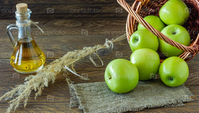 Плетеная корзина со спелыми зелеными яблоками и бутылкой яблочного уксуса на деревянном фоне
