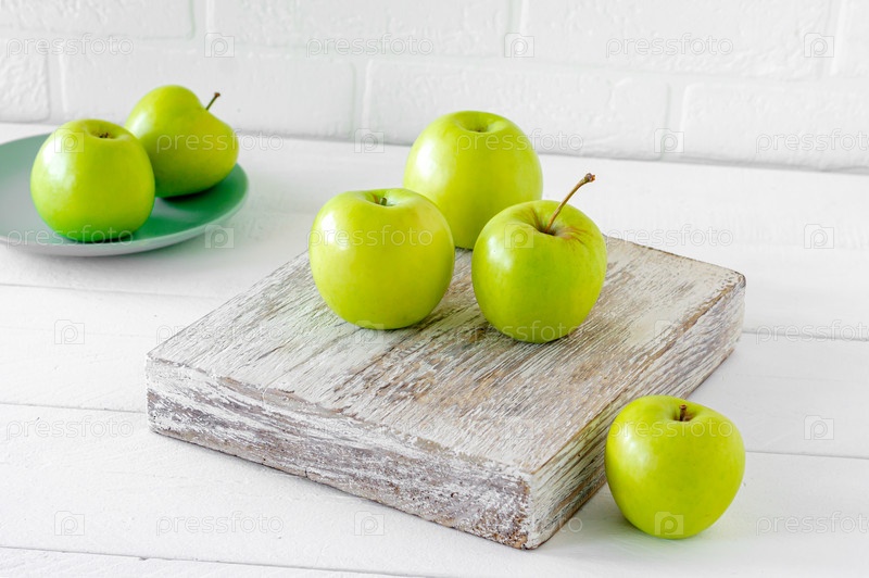 Зеленые спелые яблоки на деревянном столе. Деревенский стиль. экологически чистое хозяйство. устойчивая еда
