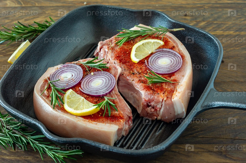Кусочки сырого стейка из свинины со специями и травами, розмарином, солью и перцем в ручке для гриля на деревянном фоне в деревенском стиле