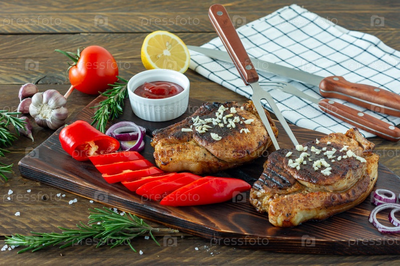 Свежее сочное жареное красное мясо на деревянной доске со специями и овощами. Ресторанная еда, вкусное блюдо