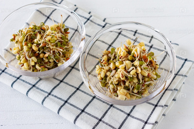 Проросшие бобы мунг в миске на белом столе. Здоровая концепция, макробиотическая пища