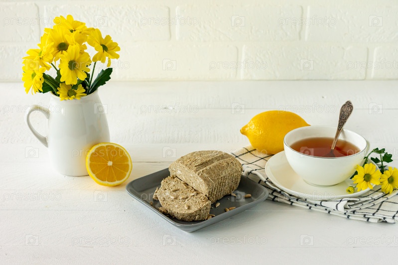Халва с орехами подается на белом деревянном столе с цветами и чаем. утренний завтрак