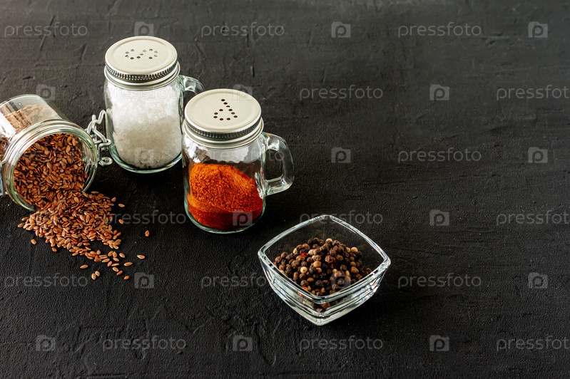 Шейкеры для перца и соли на черном бетонном фоне с копией пространства