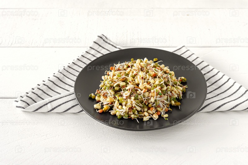 Салат из пророщенной фасоли подается на тарелке. Здоровая сырая пища. Макробиотики