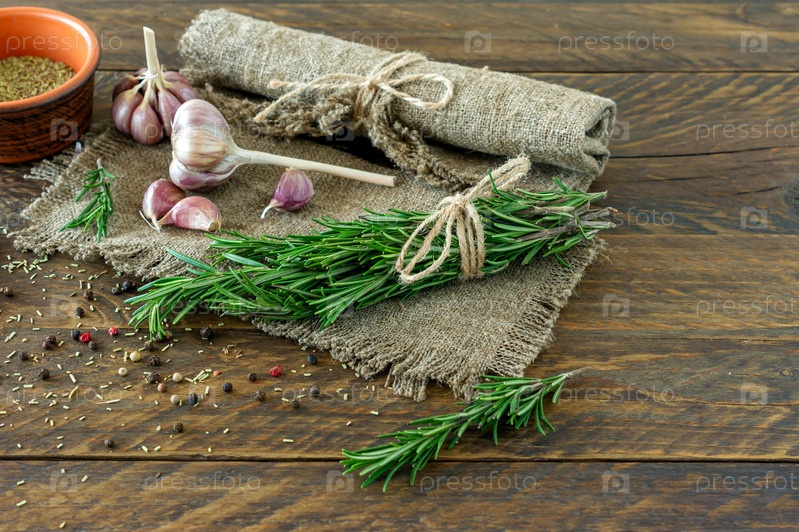 Розмари связаны на деревянной доске. Травы и специи для приготовления пищи и нетрадиционной медицины