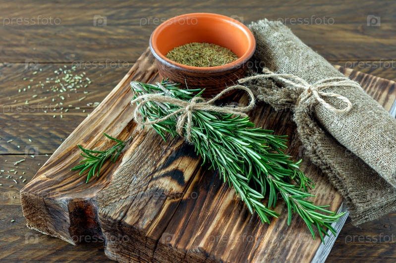 Розмари связаны на деревянной доске. Травы и специи для приготовления пищи и нетрадиционной медицины