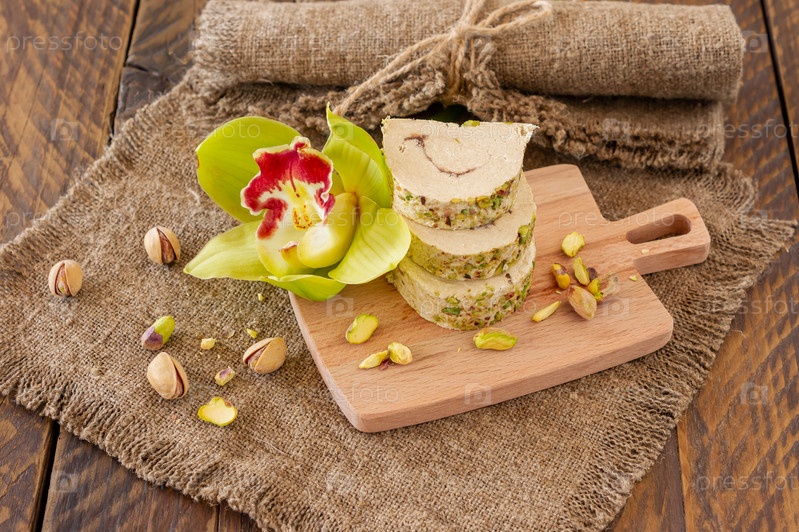 Восточные сладости - халва с фисташками, подается с цветами орхидеи