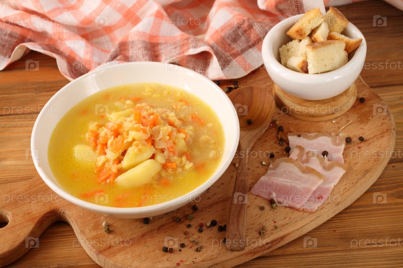 Суп гороховый с беконом на деревянном столе