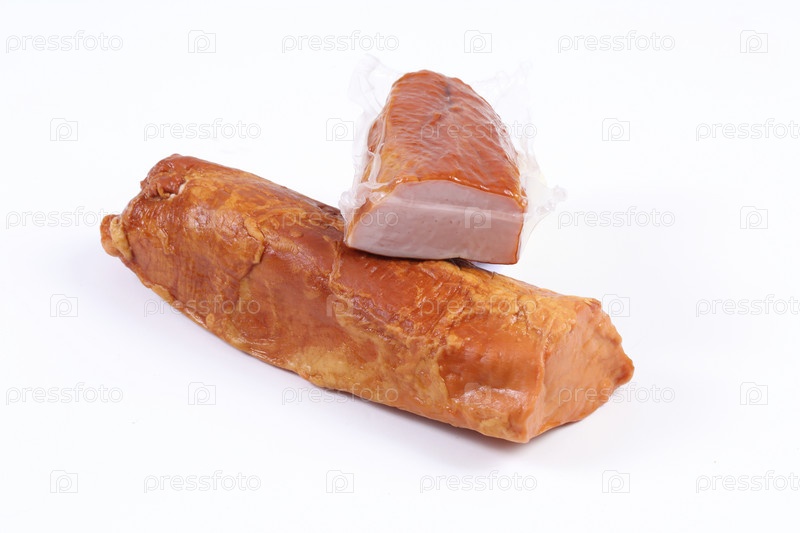 Холодный карбонат свинины в вакуумной упаковке на белом фоне