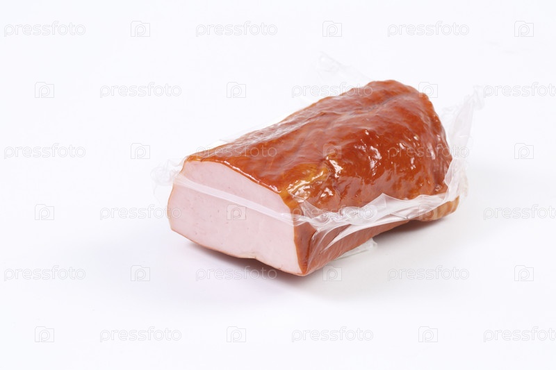 Холодный карбонат свинины в вакуумной упаковке на белом фоне