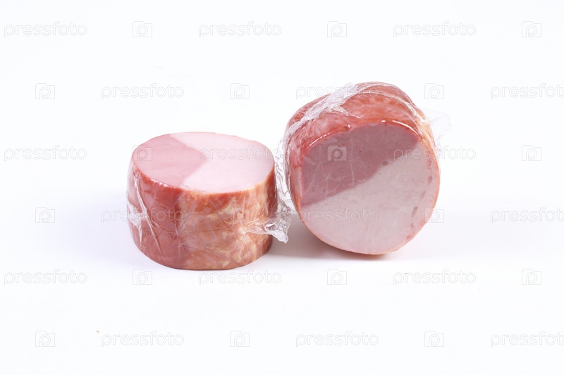 Холодный карбонат свинины в вакуумной упаковке на белом фоне