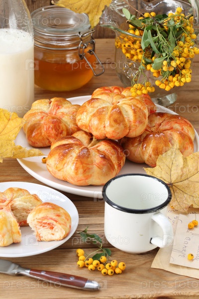 Тыквенные булочки с молоком и медом на деревянном фоне