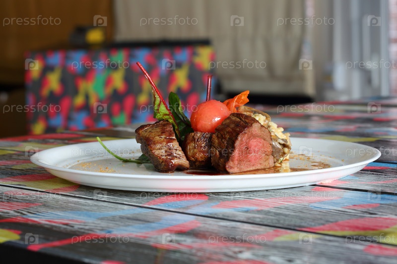 Стейк грибами,ризотто,зеленью с помидорами черри на белой тарелке