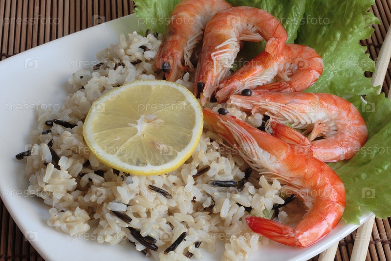 Креветки , рис,листовой салат и лимон