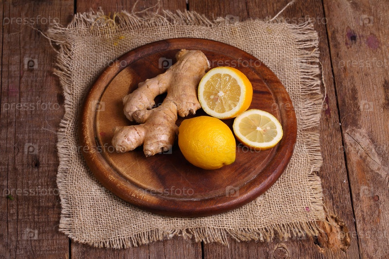 Корень имбиря,лимон на деревянной доске